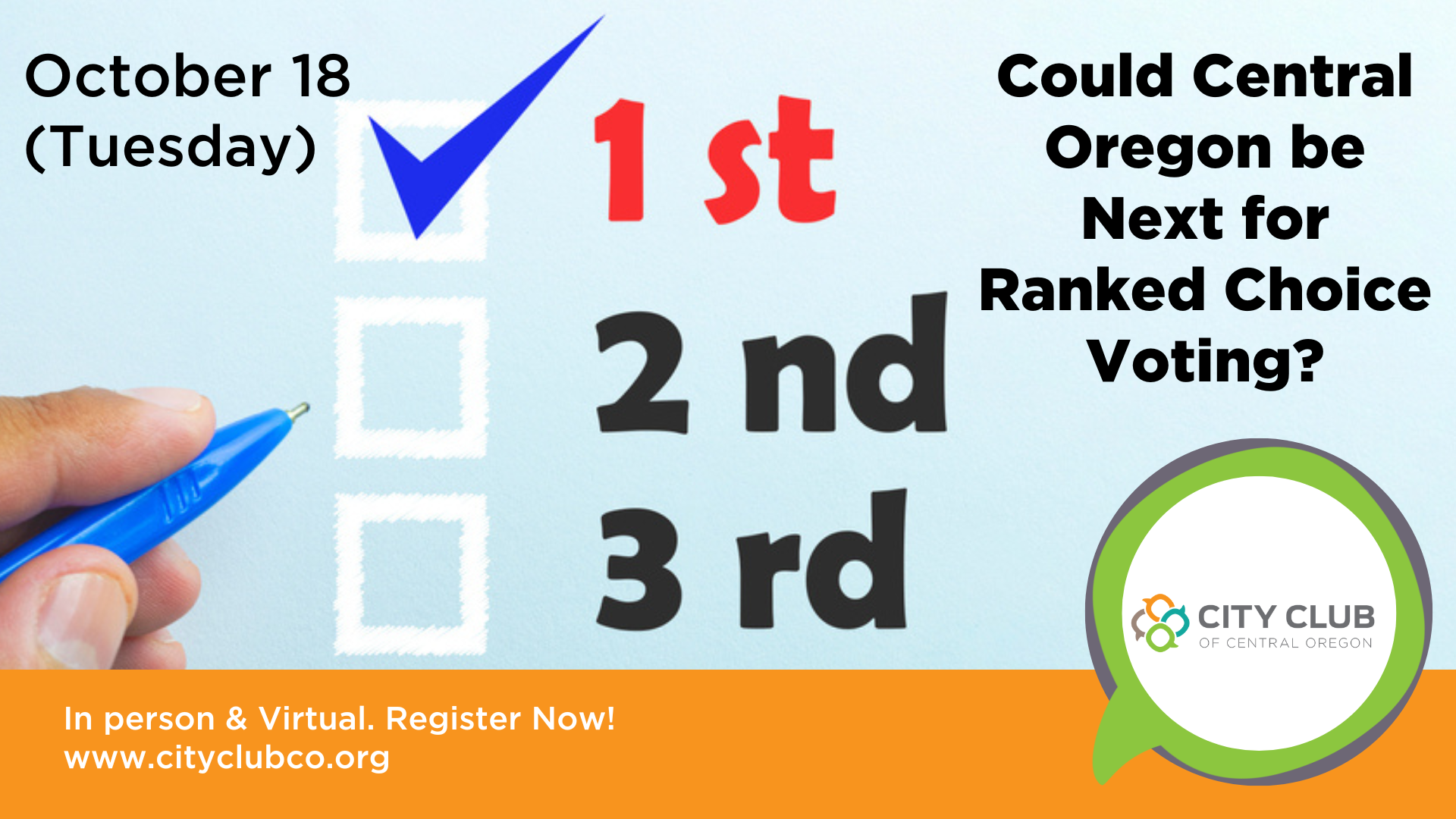 October 18 (Tue) City Club of Central Oregon Forum: Could Central Oregon be Next for Ranked Choice Voting?
